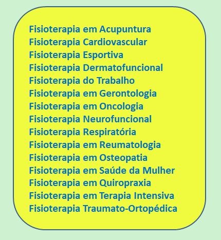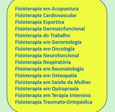 A Fisioterapia tem várias especialidades que formam um conjunto de ações para se tratar das diversas patologias e contemplam: